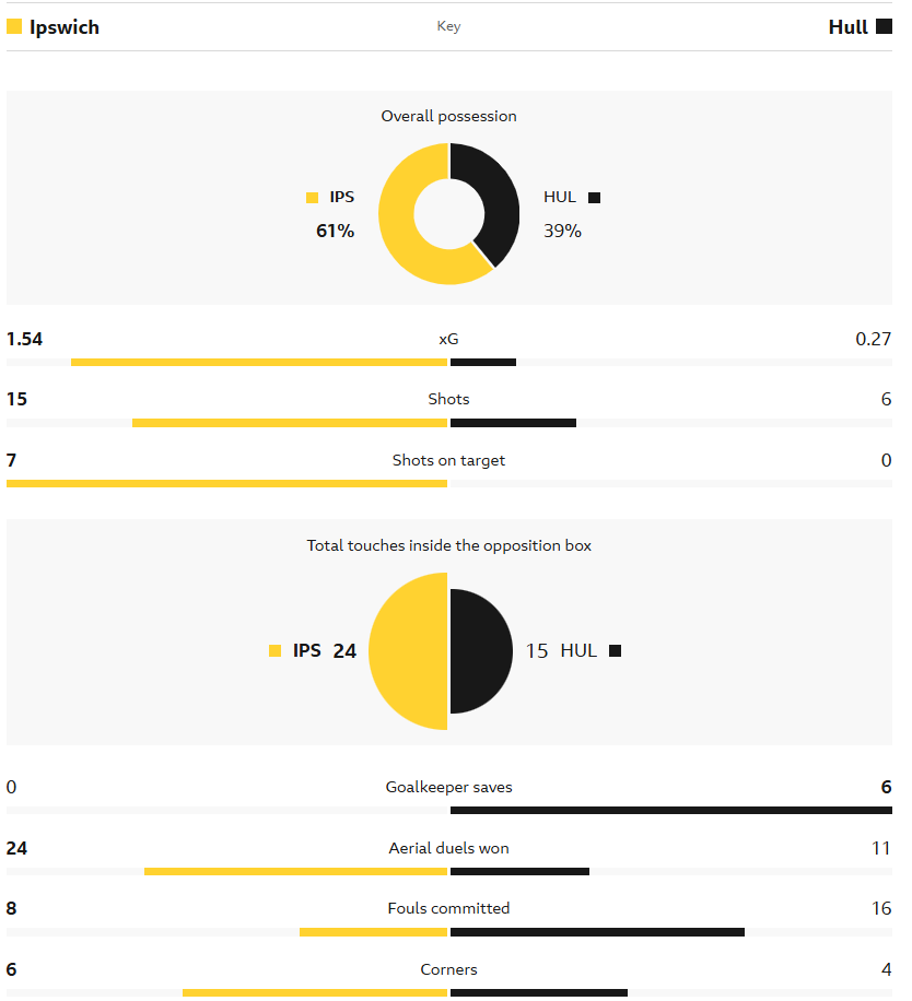 Ipswich forsatte i 2.halvleg med at være mest på bolden og selvom Hull kom lidt mere med i kampen, så gav vi intet væk og spillede tålmodigt efter at få den gyldne åbning. Lidt over midtvejs i 2.halvleg blev Marcelino Nunez spilet fri i dyben af Jack Clarke og fik afsluttet tæt inde under mål – men Igor Pandur i Hulls mål stod godt placeret og fik afværget i to omgange.